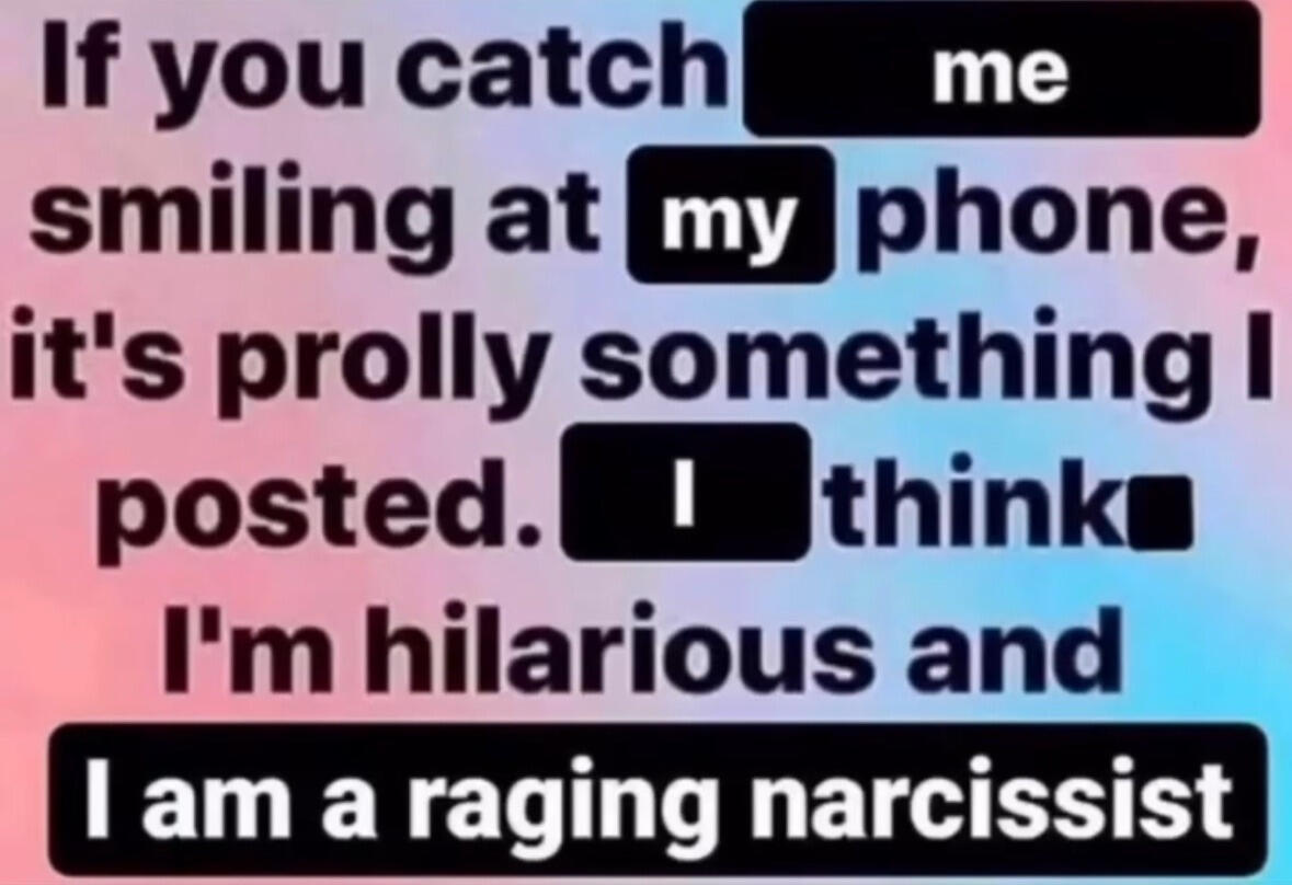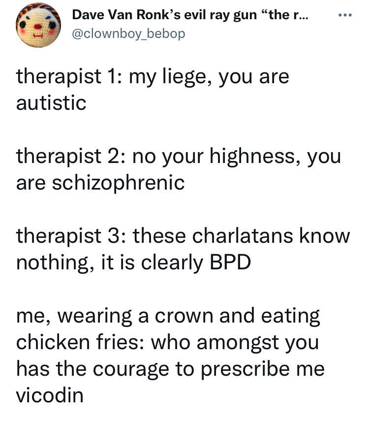 β΄ i have npd, but i don't take myself too seriously nowadays and am very tongue in cheek about it. if you see me running my mouth like "i'm better than you!" please assume i'm fucking around and playing it up for the bit. i'm a chronically online autistic neet in my mid 20s, i can't drive, and i still live with my mother. i'm joking, i promise.β΄ i have memory problems as a result of brain issues, brain fog, brain rot, being harebrained, choosing beauty over brains, and a lack of a brain in general. hooray!β΄ i may present or refer to myself in ways that are inconsistent or contradictory label wise. if you know, you know, but i am always bisexual.β΄ i also have ocd. that's it. that's all you're getting. if you wanna know more you're just gonna have to pay attention, i guess.β΄ mind your own business.